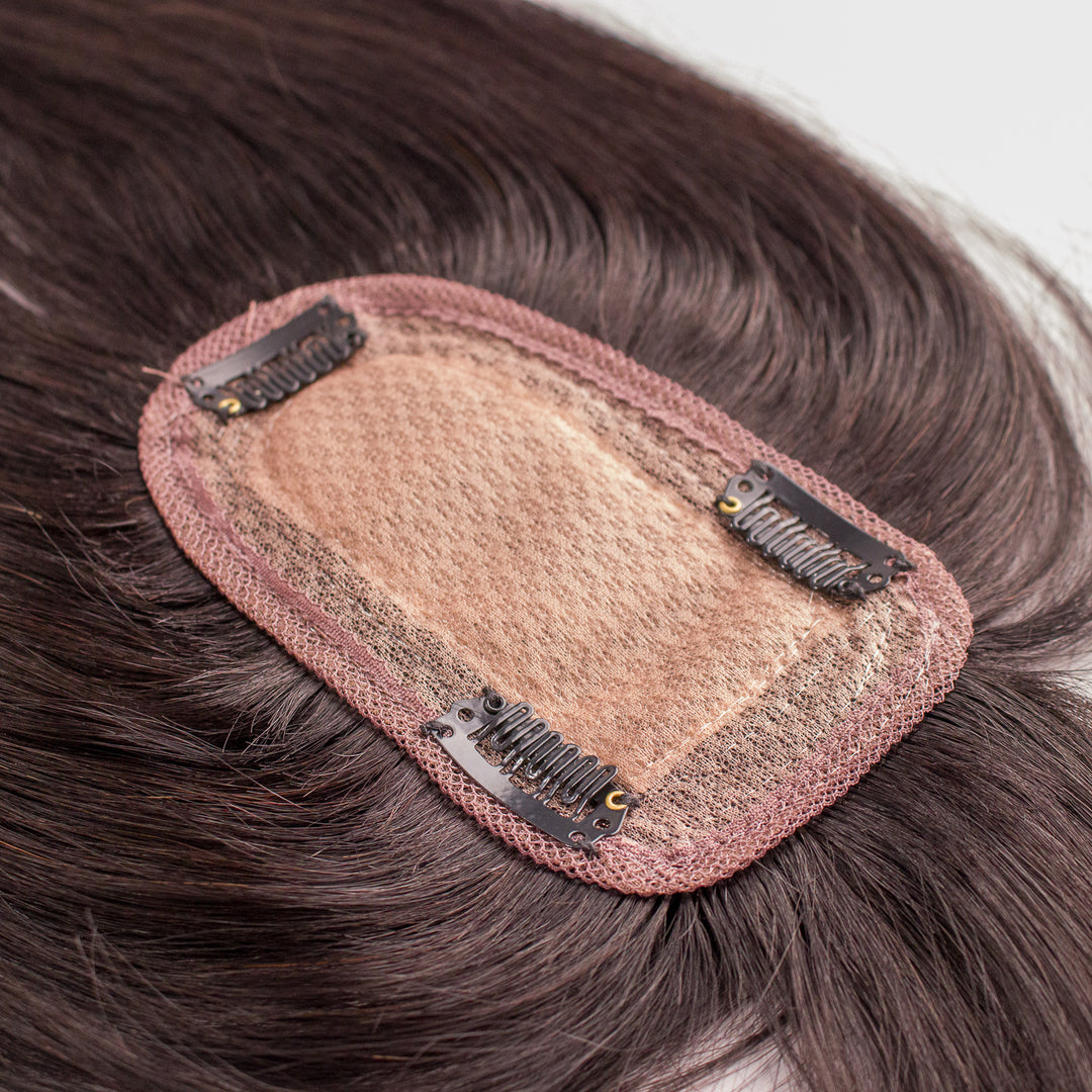 El mas conveniente de nuestra familia de toppers con 7 x 13 cm de base y 30 cm de largo. Ideal si buscas un flequillo y agregar densidad a los lados. Partidura al medio tipo silk mediana. 100% cabello humano